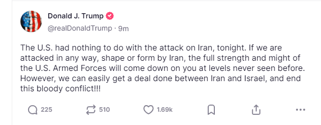 伊朗国防部长阿齐兹·纳西尔扎德11日曾表示,如果伊美谈判最终失败,伊朗与美国发生军事冲突,伊朗将袭击美国在中东地区的军事基地。以色列13日对伊朗发动突袭后,伊朗宣布退出与美国的第六轮核问题谈判。伊朗总统佩泽希齐扬14日表示,只要以色列继续袭击伊朗,伊朗就不会恢复与美国的谈判。同日,伊朗外交部发言人表示,在敌人对伊朗发动战争之时,美国却不顾外交和对话途径,一直支持以色列的侵略,包括袭击伊朗的和平核设施。在以色列停止对伊朗的侵略之前,与侵略者的最大支持者和帮凶进行对话毫无意义。他还说,当前形势下,伊朗的主要重点是“反击敌人的侵略”。